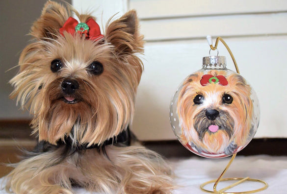 We offer hand-painted custom pet portraits on any size canvas, wine glasses, beer mugs, ornaments, and tea and coffee cups.